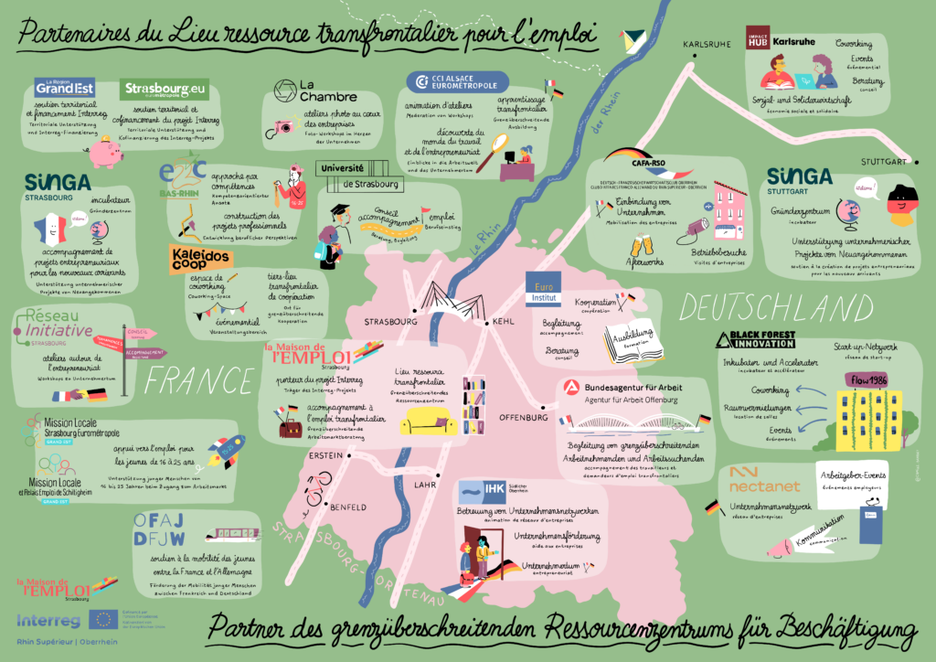 Le projet du Lieu ressource transfrontalier pour l’emploi est piloté par la Maison de l’Emploi et cofinancé par le FEDER dans le cadre du programme Interreg VI Rhin Supérieur. Il réunit 20 partenaires français et allemands, dont l’ensemble est présenté sur la carte ci-dessous.